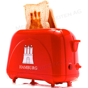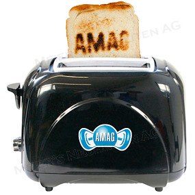 Der erste Toaster, der Ihr Logo auf den Toast röstet, mit Stufenschaltung 1-6 mit leuchtendem Betriebs- und Stopknopf, Kunststoffgehäuse, Röstvorrichtung aus Metall. Röstvorrichtung für zwei Toastscheiben mit herausnehmbare Krümelauffangschale.