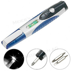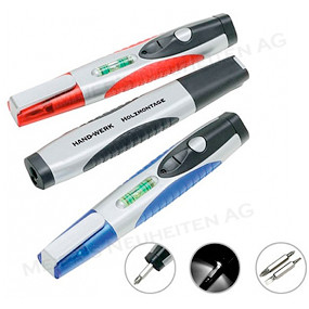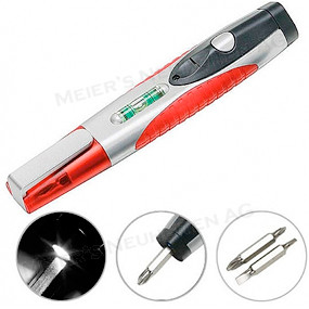 Bemerkungen: Raffiniert und durchdacht ist dieses Werkzeug. Bestückt mit sechs Funktionen integrierter Wasserwaage, LED, 2 Bits und Verschlusskappe mit Befestigungsclip.