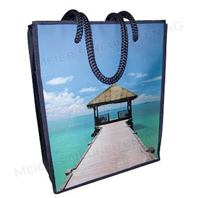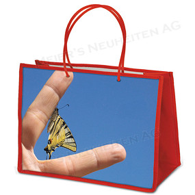 Die Taschen gibt es in verschiedenen Farben, Grössen und Materialien. Alle Tasche werden mit einem 4-farbigen Druck auf Laminierten Papier aussen auf beiden Seiten eingeschweisst!