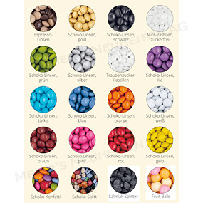 Bemerkungen: Das Kunststogff-Röhrchen kann mit folgenden sortenreinen Füllungen bestellt werden: Zuckerfreie Mintpastillen, Mini Espresso Schokolinsen (braun + beige gemischt) Traubenzuckerpastillen, Fruitballs, Salmiak-Splitter oder Mini-Schokolinsen bunt gemischt oder sortenrein. Die Schokolinsen gibt es in den Farben: blau, braun, gelb, grün, lila, orange, pink, rot, schwarz, türkis oder weiß. Es können auch 2-3 Wunschfarben (gemischt) in einem Reagenzglas bestellt werden. Mini-Schokolinsen in gold oder silber sowie vegane Mini Schokolinsen, bunt gemischt oder Schoko-Goldsterne (weiter Füllungen auf Anfrage).