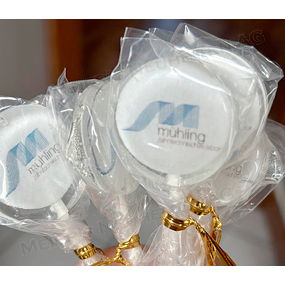 Flachlolly Zuckerfreier, Vegan Logo auf Basis Esspapier. Auf das Esspapier wird das Logo gedruckt. Das Esspapier wird in den Lolli verarbeitet und ist 100% essbar.