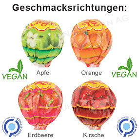 Der 12g Kugel-Lolly von Chupa Chups in den gemischten Geschmacksrichtungen Apfel, Orange, Erdbeere und Kirsche wird in der Box aus weissem Glanzkarton zum rundum sympathischen Werbeträger.