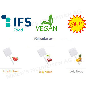 Beschreibung: Lolli ca. 8g. mit Erdbeere-, Kirsche- oder Tropicgeschmack vegan