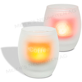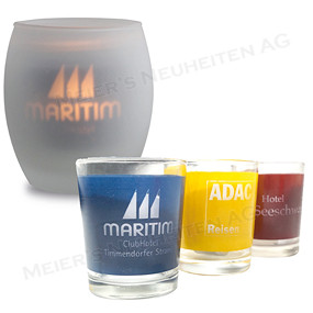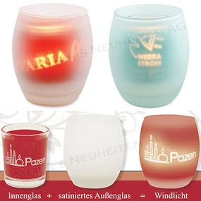 Das originelle Windlicht besteht aus einem bedrucktem Innenglas einem Teelicht und einem gefrostetem Aussenglas. Dieses Windlicht aus zwei ineinander gesetzten Gläsern verbreitet einen besonderen Lichteffekt, Ihr Logo wirft einen Schatten auf das äussere Glas, wo sich das flackernde Licht der Kerze zu bewegen scheint.