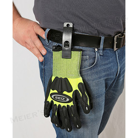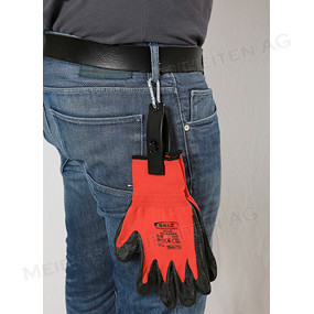 Bemerkungen: Zur Befestigung von Arbeitshandschuhen, Caps usw. mit einer Einhandbedienung zur einfachen Entnahme. Die Befestigung der Handschuhe usw. erfolgt durch Zusammendrücken der Klammer. Ein einfacher Daumendruck genügt und die Handschuhe usw. lösen sich wieder aus ihrer Befestigung. Durch die grosse Öffnungsweite können auch sperrige Teile aufgenommen werden, sehr guter Halt durch den einfachen Rast-Mechanismus und gezackte Klemmen. Befestigung mittels Gürtelclip oder mitgeliefertem Karabinerhaken.