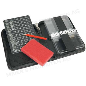 Bemerkungen: Jass- und Yatzyetui Etui mit Reisverschluss inkl. zweiseitig bedruckte Jasstafel mit Jasser Z/Z sowie Yatzy Spiel auf der Rückseite, 1 Kreidestift, 5 Spielwürfel, 1 Schwamm in Plastik Box, 1 leere Plastik-Box für Jasskarten. Selbstverständlich kann das Etui mit Standard-Spielkarten oder Werbespielkarten mit Ihrem Logo bestückt werden. Wir können Ihnen sämtliche Jass-, Spiel-, Puzzle-, Quartett- oder andere Karten liefern. Fragen Sie uns an.