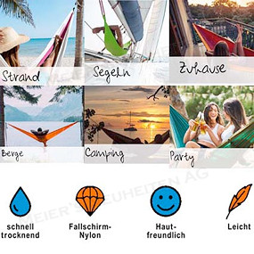 Bemerkungen: Die Hängematte aus recyceltem Fallschirm-Nylon mit einer Tragkraft bis zu 250 Kg. ist platzsparend und langlebig. Ideal für zu Hause auf dem Balkon, Reisen, Segeln, Camping im Park am See usw. Alles was Sie brauchen sind lediglich zwei feststehende Elemente um die Hängematte mittels mitgelieferter Karabinerhaken dazwischen platzieren zu können. Pro Seite ist die Hängematte mit je 1m Nylonseil ausgestattet. Zum Transport kann die Hängematte platzsparend im Stoffbeutel verstaut werden.